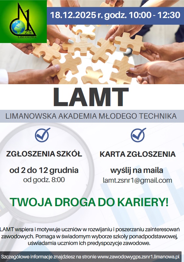 - wychowawca/opiekun wysyła kartę zgłoszenia na adres lamt.zsnr1@gmail.com. Rekrutacja zostaje uruchomiona 02.12.2025 r. o godz. 8:00. O zakwalifikowaniu na warsztaty decyduje data wpływu karty zgłoszenia.